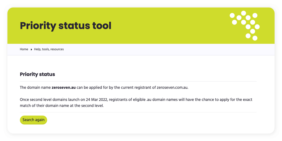 In some rare cases, more than one applicant will be eligible to apply for Priority Status for the same .au direct name – if, for instance, Applicant A already owns bestwebsiteever.com.au, and Applicant B already owns bestwebsiteever.org.au, they might both lay claim to bestwebsiteever.au. In these cases, the creation date of each applicant’s domain name licence will determine who takes priority.