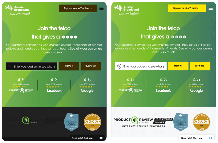 In the example below, you can see an automatic colour conversion on the Aussie Broadband website results in colours that are off brand.