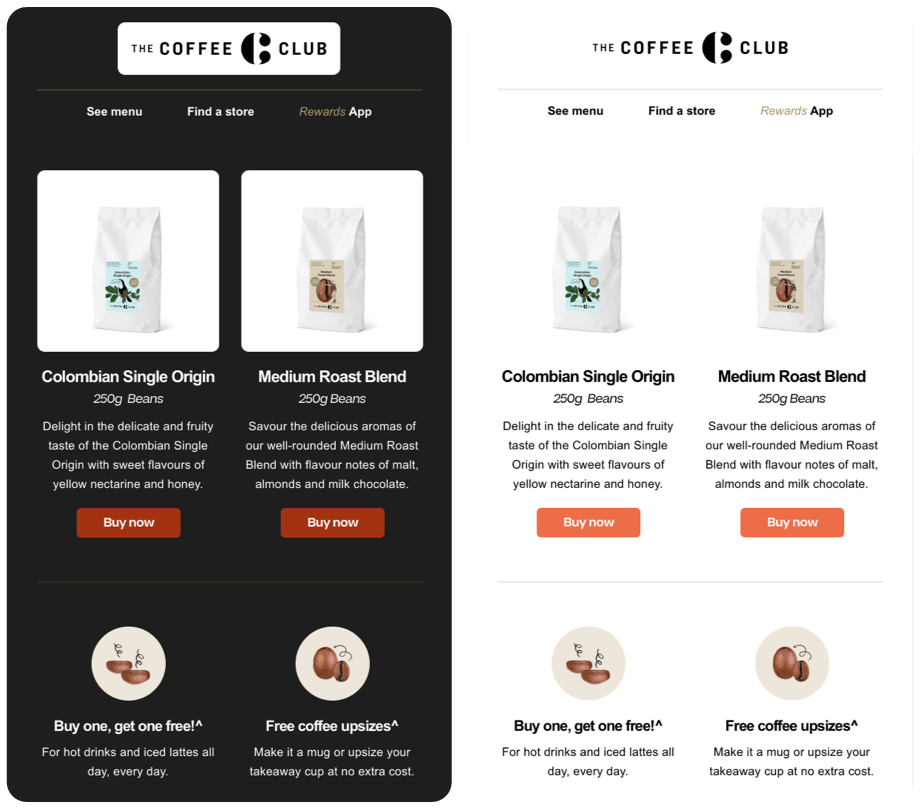 Emails present another challenge, however, because while virtually all the major email clients have some kind of dark mode setting, they all render dark mode a little differently – it’s not a universal setting that’s always applied the same way.