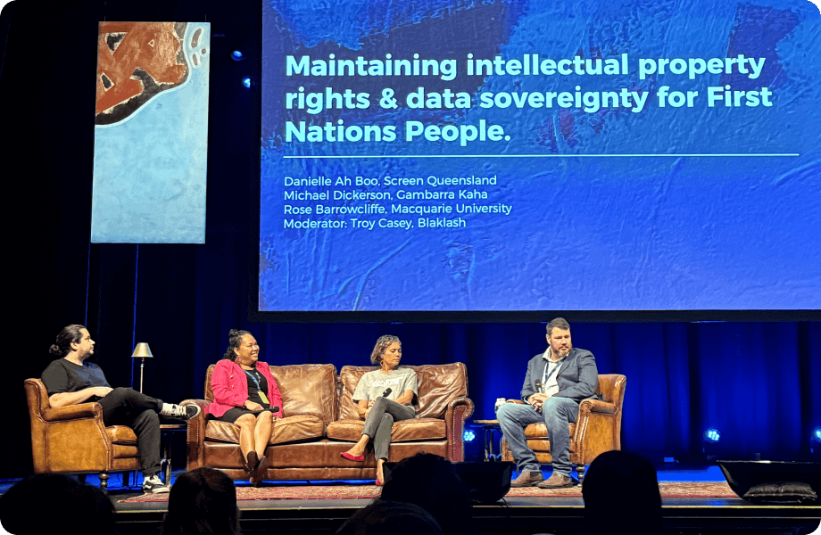 - Troy Casey of Blaklash, with Danielle Ah Boo of Screen Queensland, Rose Barrowcliffe of Macquarie University, and Michael Dickerson of Gambarra Kaha ANZ DC, discussed the key considerations of intellectual property rights and data sovereignty for First Nations People.