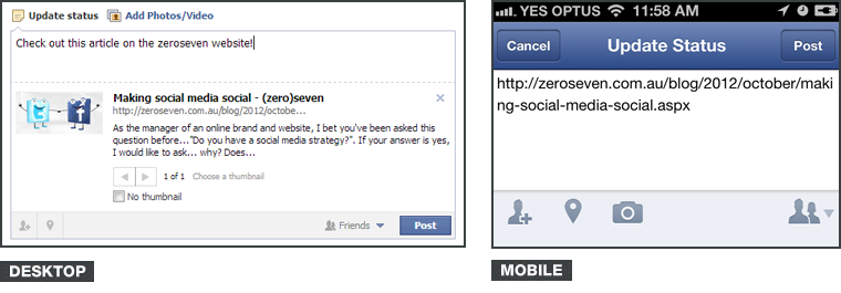 Facebook makes the decision of how it displays on my feed after I select the Post button and it ends up being a less than perfect user experience. If I share a link through Facebook mobile, I won't get any feedback from it, because visually, it renders badly for my Facebook friends and I end up looking like a noob.
