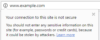 The first phase of these changes has seen the introduction of more explicit labeling of the site’s connection security in the browser’s address bar with an enhanced security indicator. Initially, pages that collect credit card details or passwords (e.g. login screens or account registration pages) over HTTP will be labeled as “Not secure,” providing a clear warning to users to think carefully before proceeding. The plan is to prompt developers and IT administrators to adopt HTTPS, with future releases of browsers eventually labeling all HTTP pages as not secure.