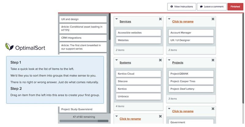 Card sorting can be done through software such as Optimal Sort (part of the Optimal Workshop).
