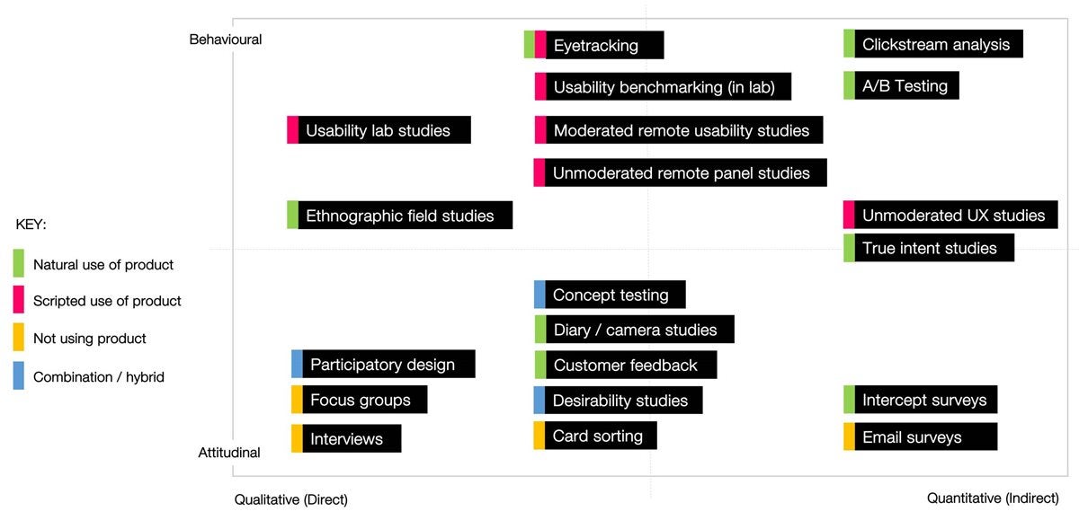 There is a wide range of research methods available to evaluate user experience and choice of method depends on the outcome of what you’re trying to achieve. Methods range through qualitative vs quantitative, behavioural vs attitudinal, as well as in-person vs remote methods.